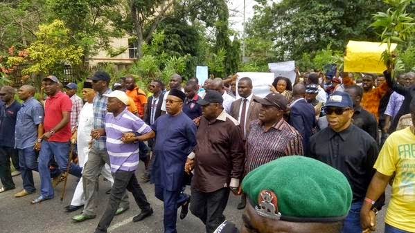 APC Uyo chieftains and members of the party are currently on the streets of Uyo, Akwa Ibom State marching towards the INEC office in a peaceful protest insisting INEC is about to announce a rigged election result in the State. The protest is been led by the APC Governorship candidate in the State, Umana Okon Umana and the State APC Chairman, Dr. Amadu Attai. Armed police and soldiers are also fully present in their numbers.